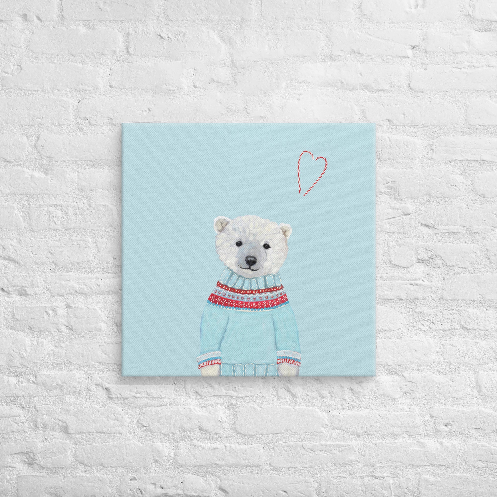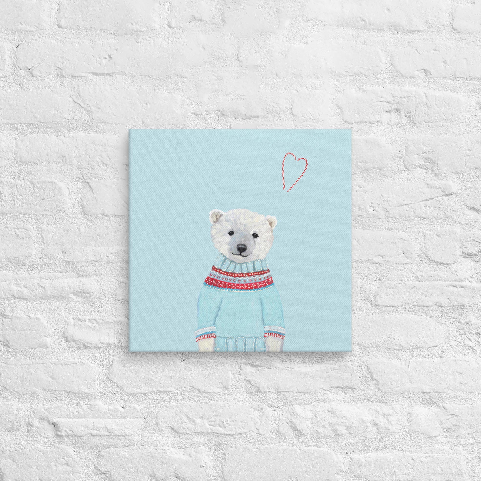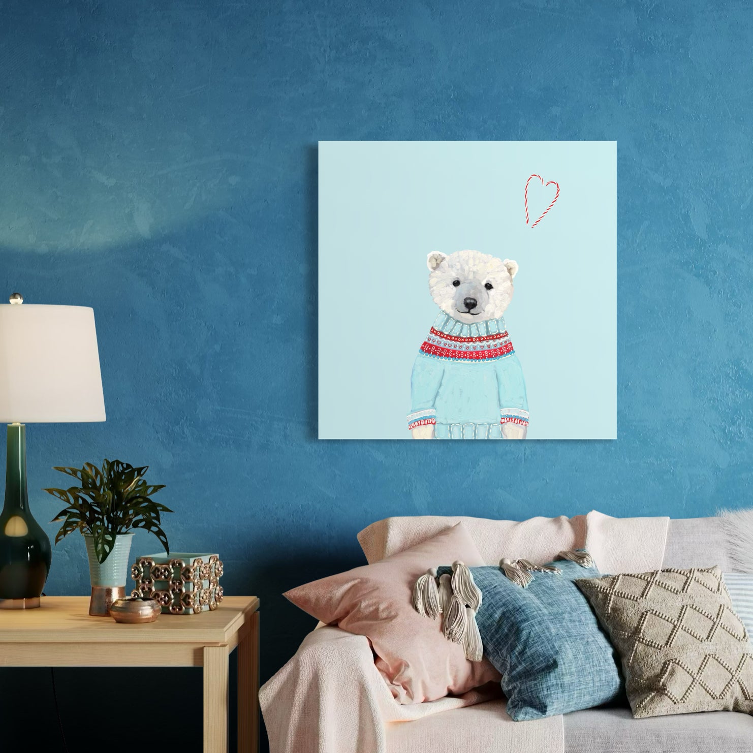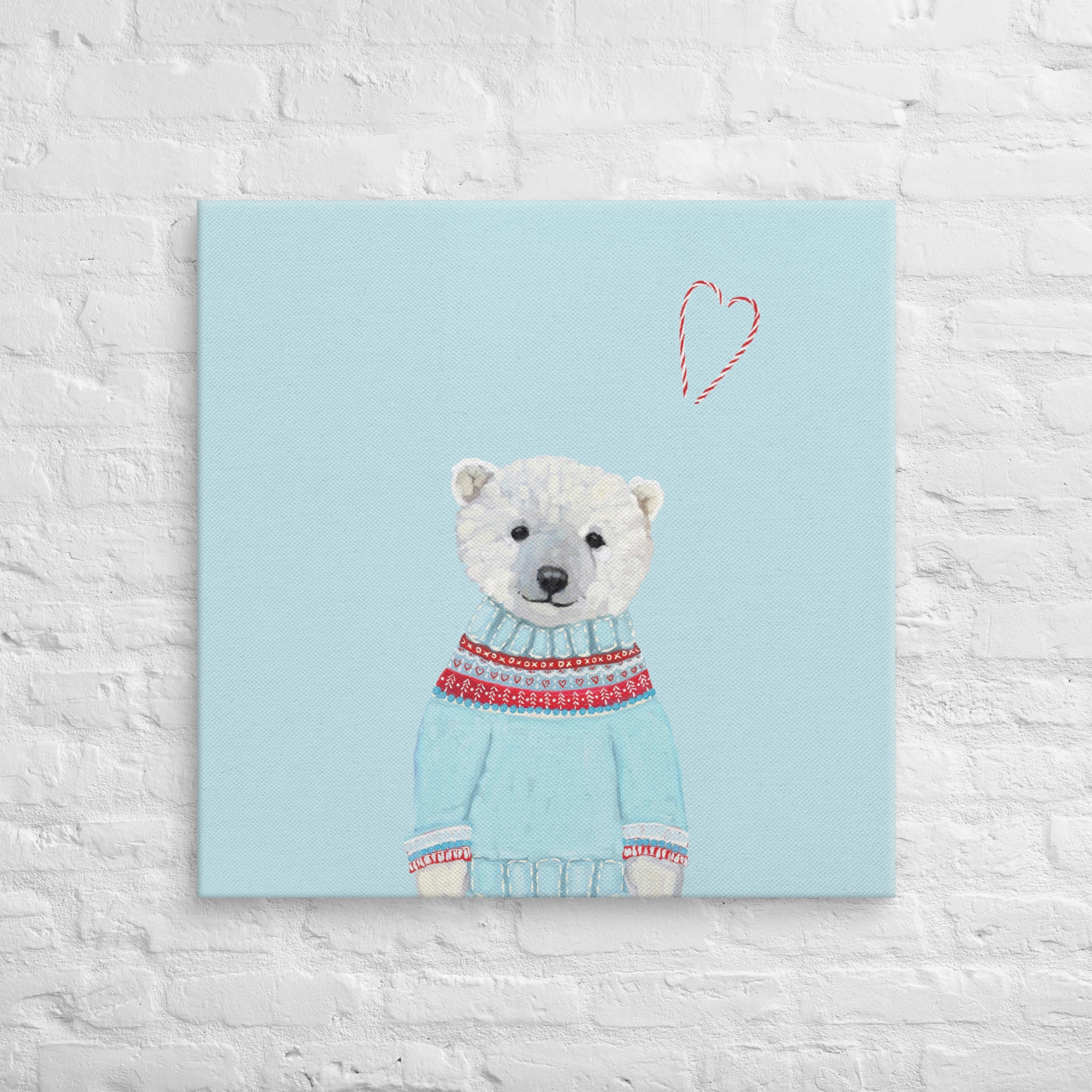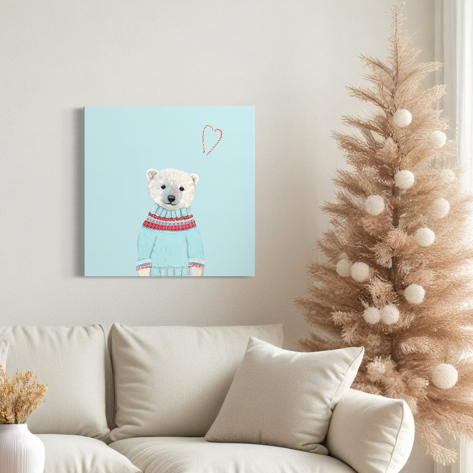 Dressed in a light blue and red striped sweater, this polar bear sends love and holiday spirits!