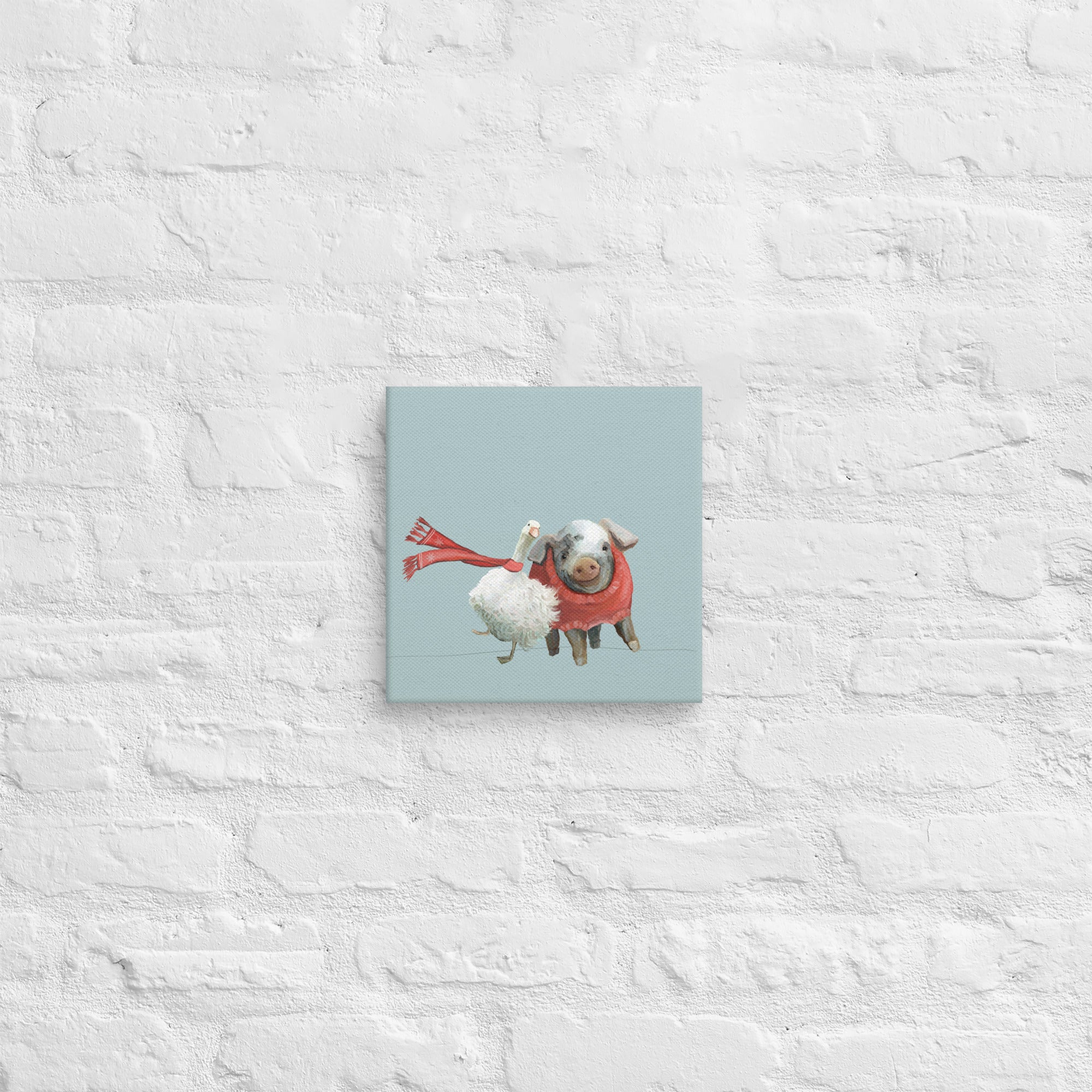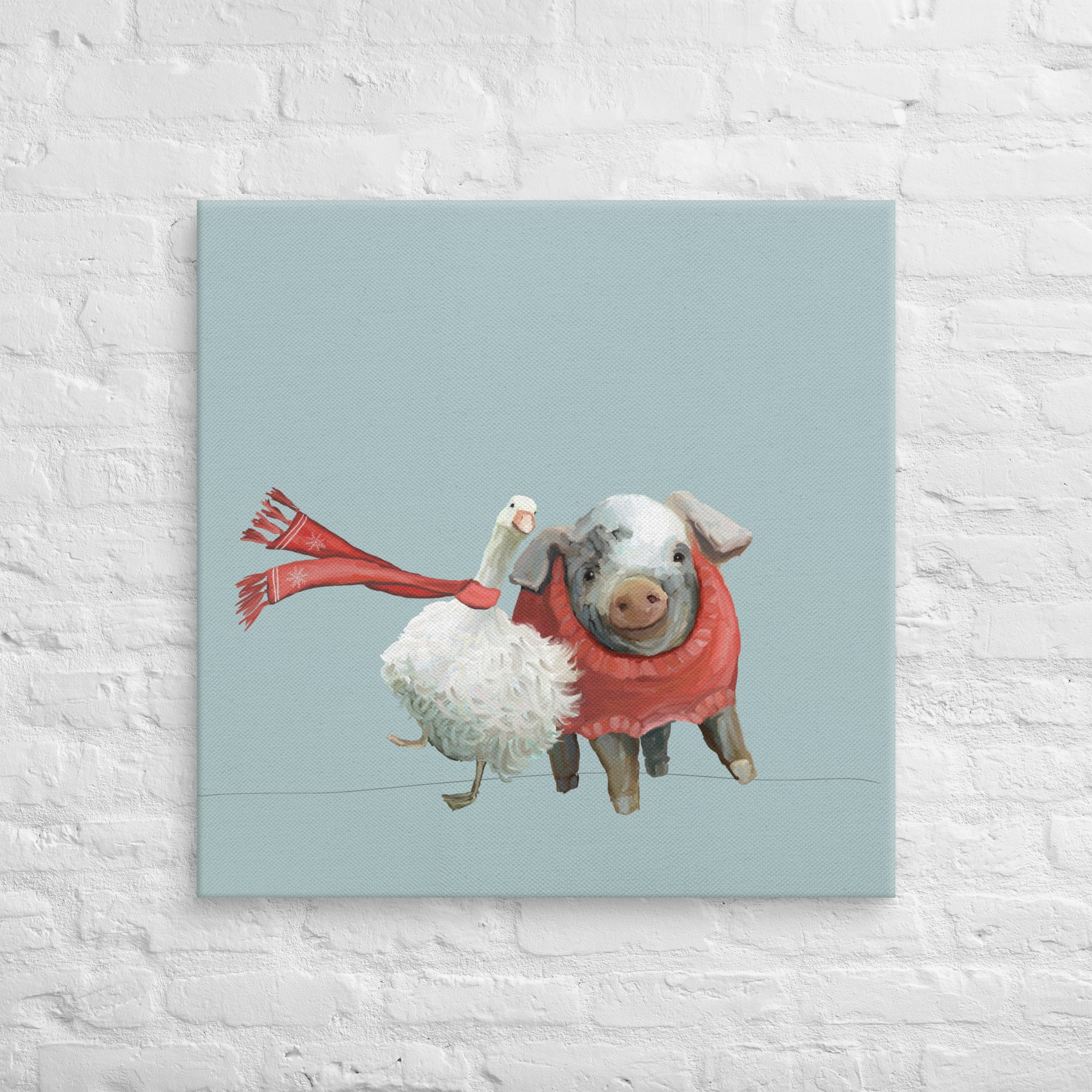 A goose and a pig play during the most wonderful time of the year. The sweater and the scarf are matching!