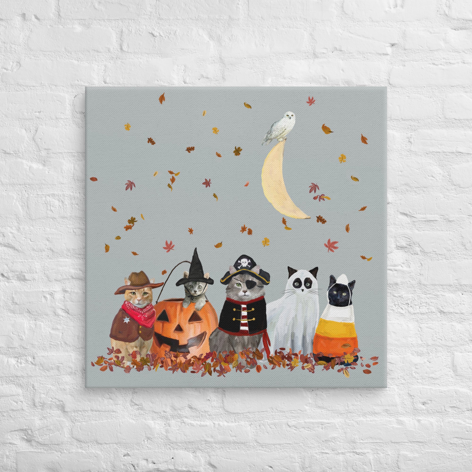 What an adorable squad of trick-or-treaters! This cluster of cats wear costumes as they go out for Halloween.