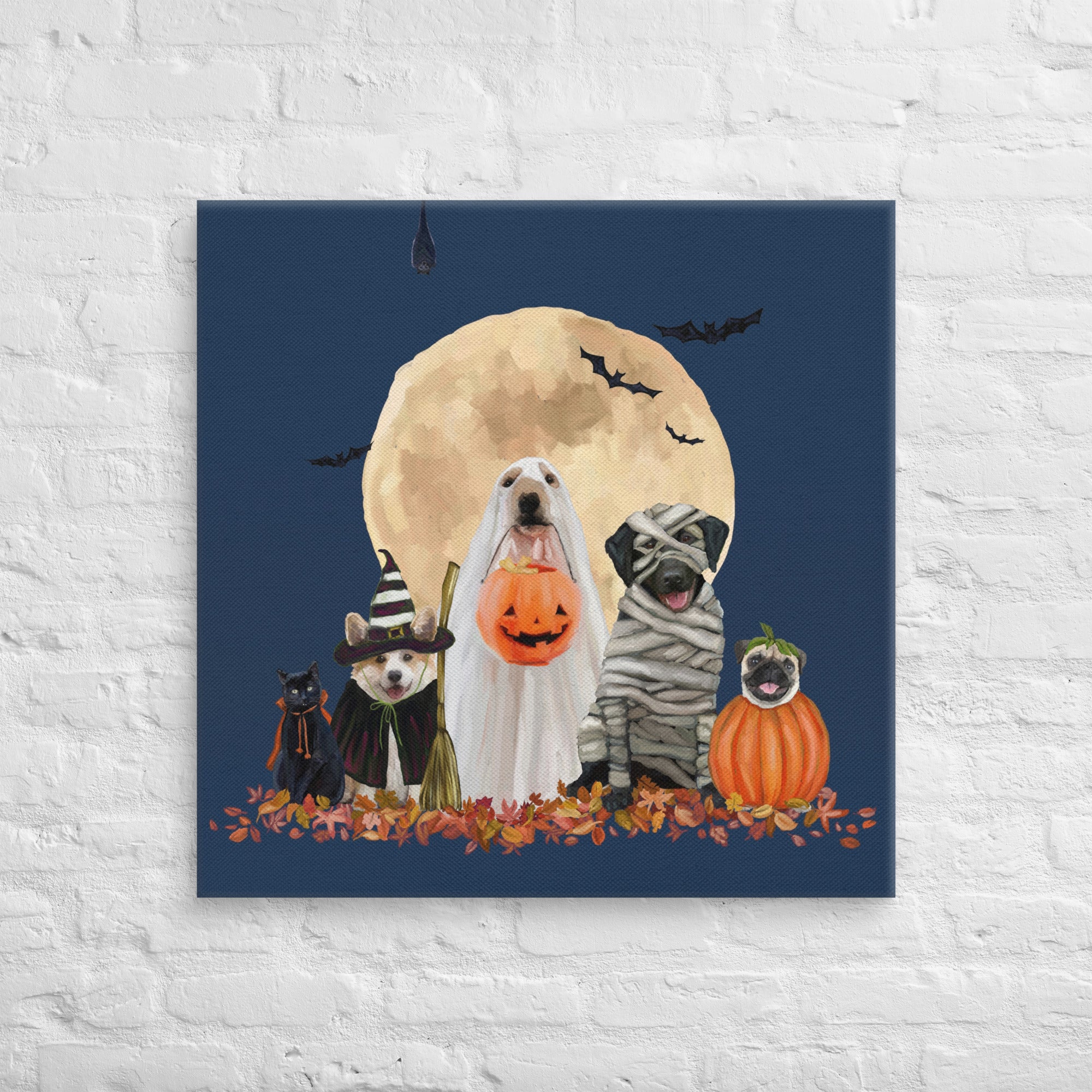 An adorable bunch of trick or treaters! This pack of dogs have on their best costumes for Halloween!