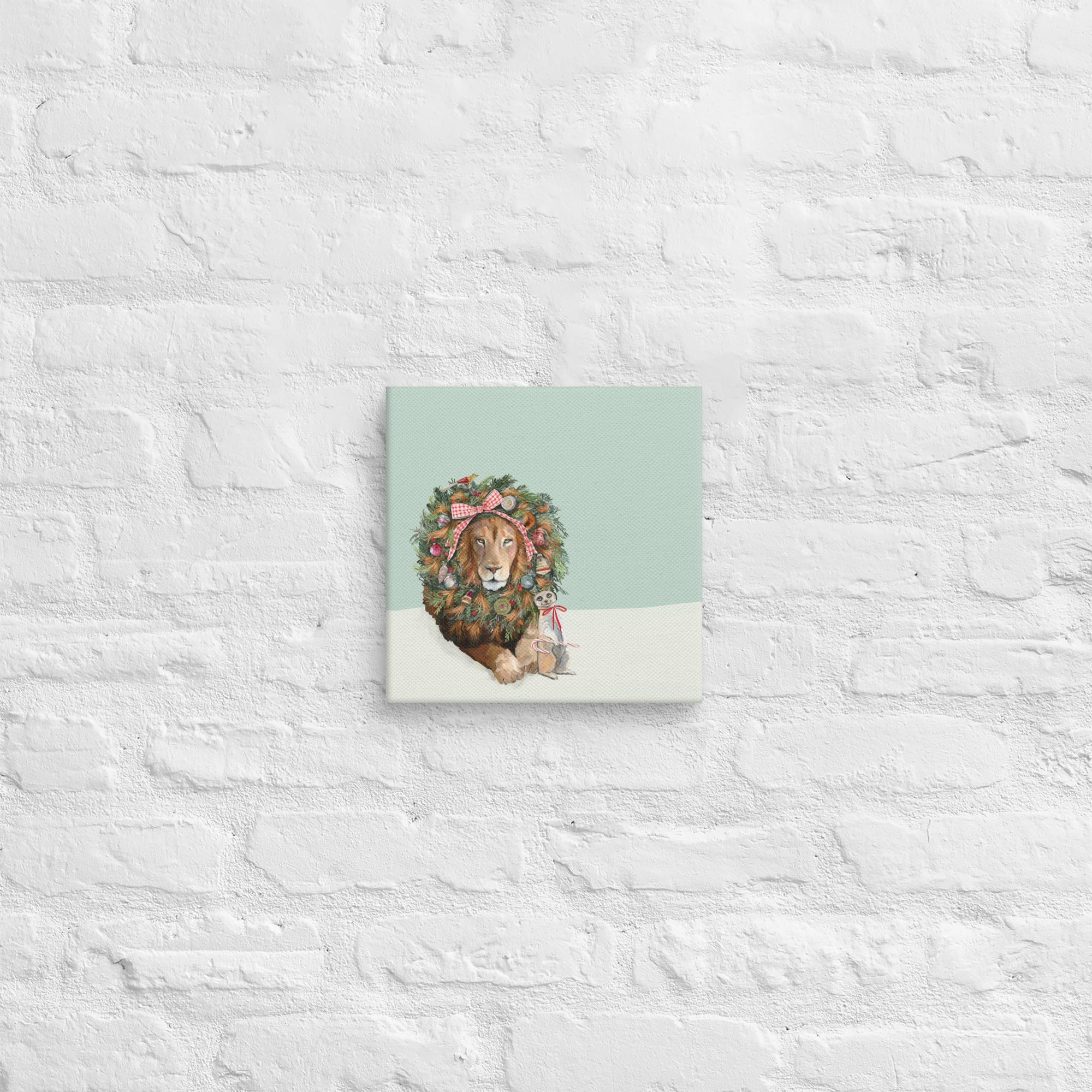 A lion and a meerkat celebrate the holidays together, wearing a decorated wreath and matching bows.