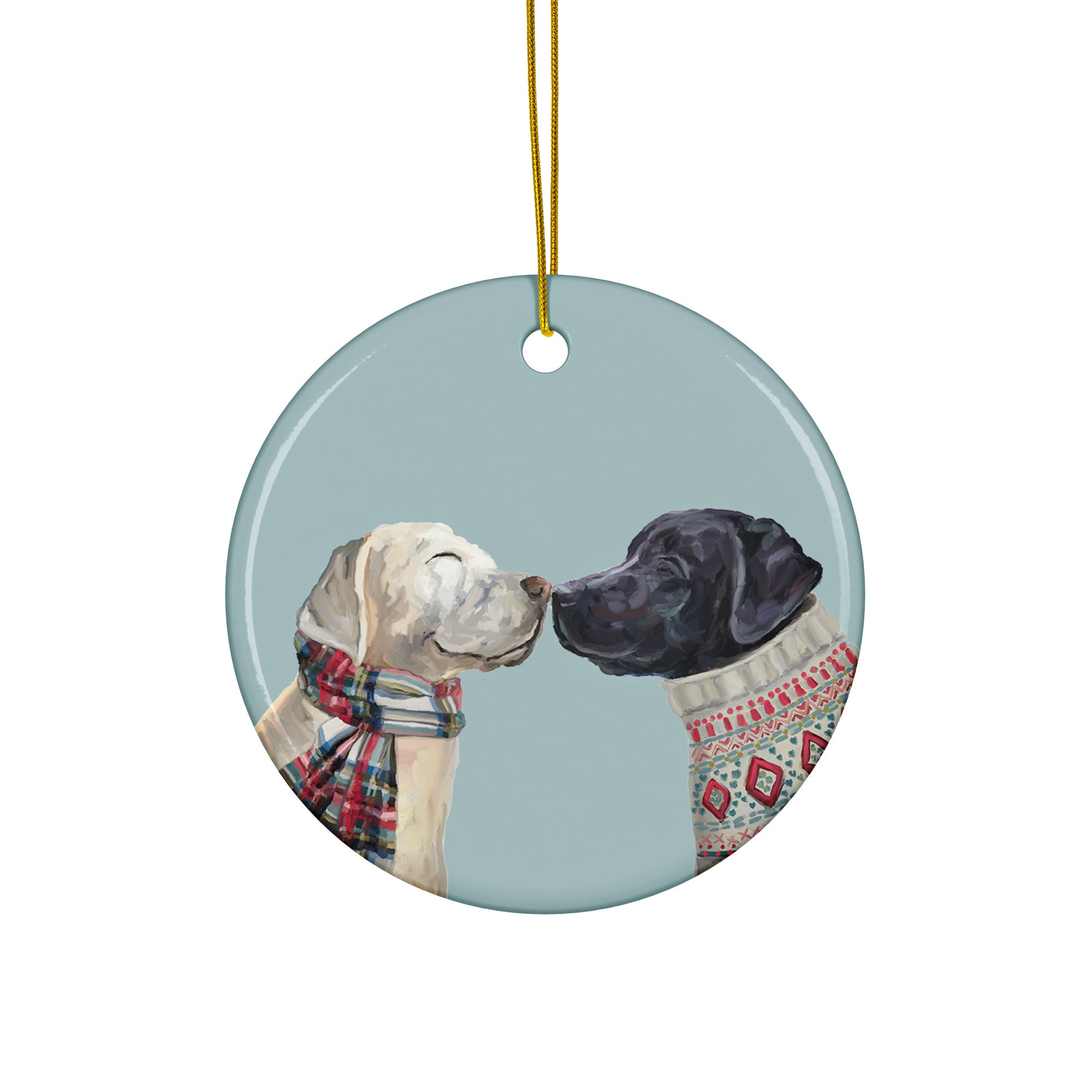 Two dogs show affection to one another while dressed in their holiday best knitwear for the season in this delightful art piece by Cathy Walters....made into an ornament!