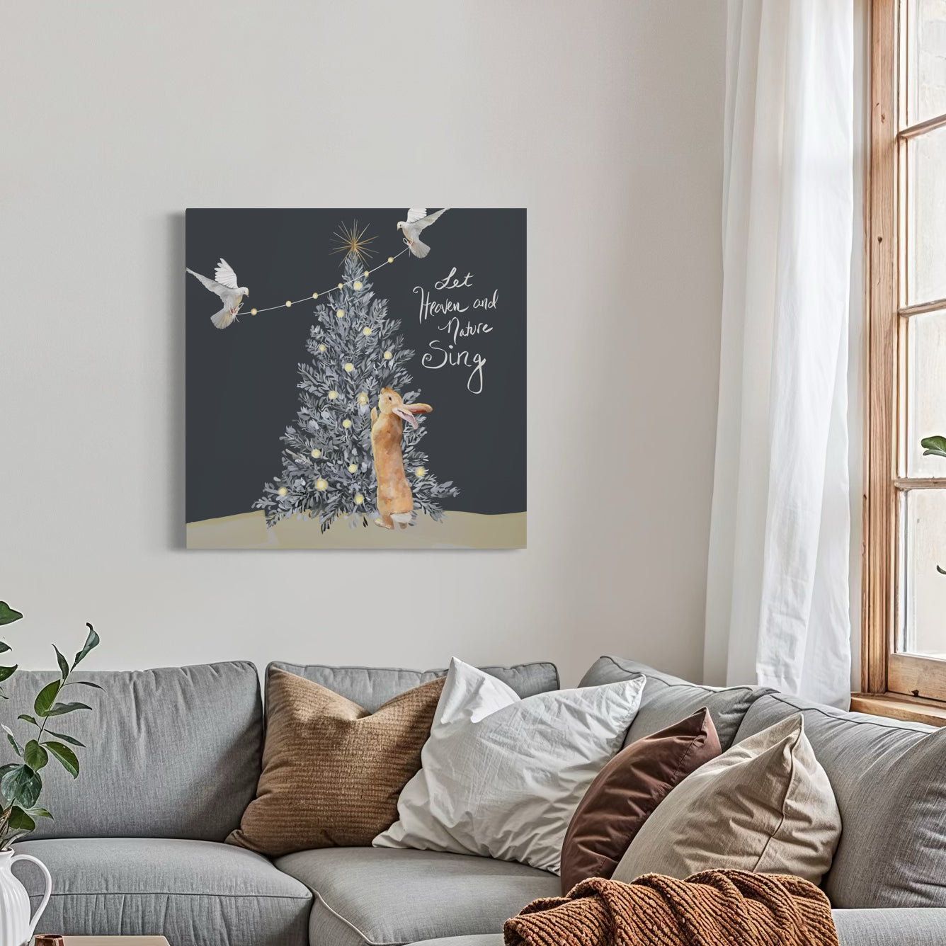 A rabbit gets some help decorating a Christmas tree from two doves flying in lights.