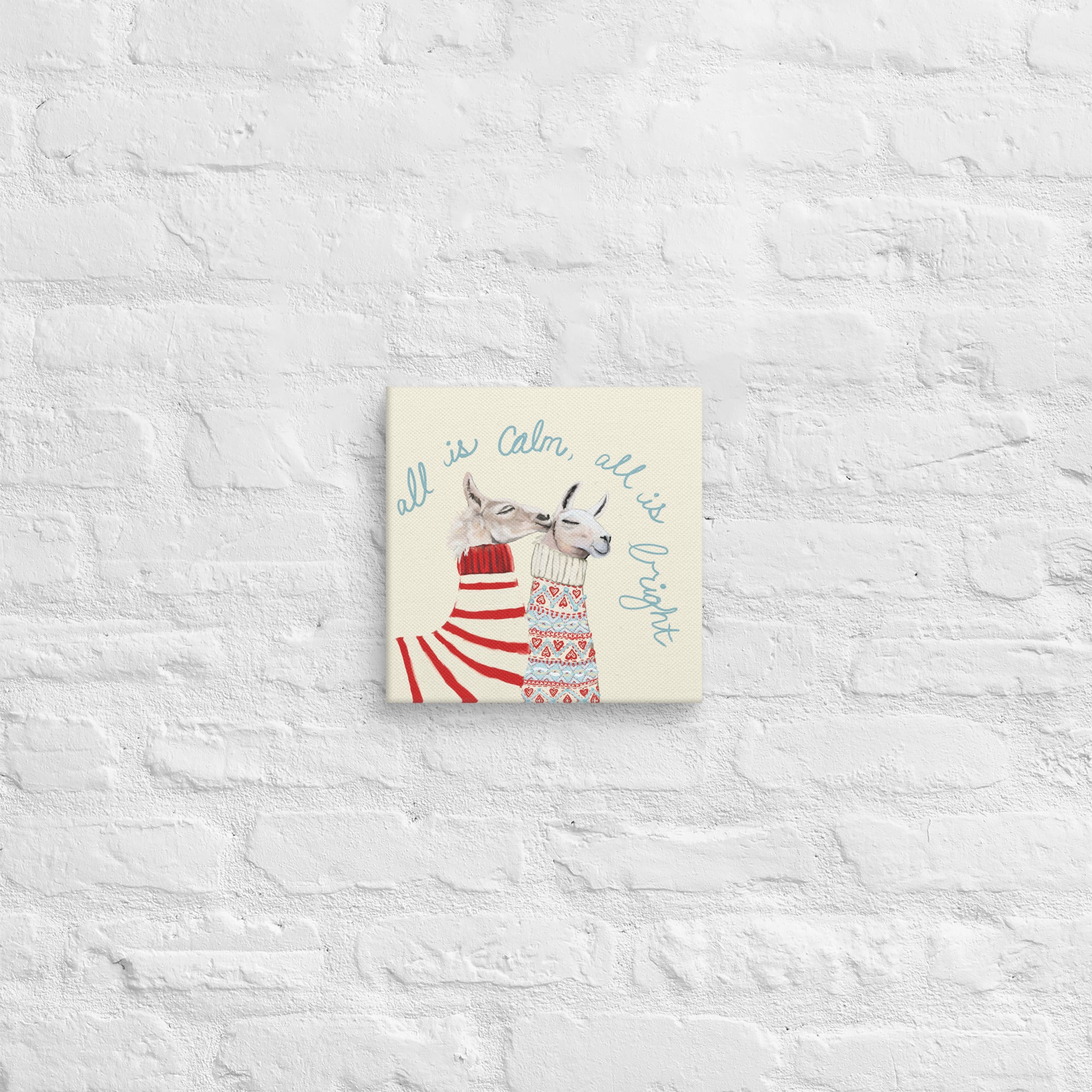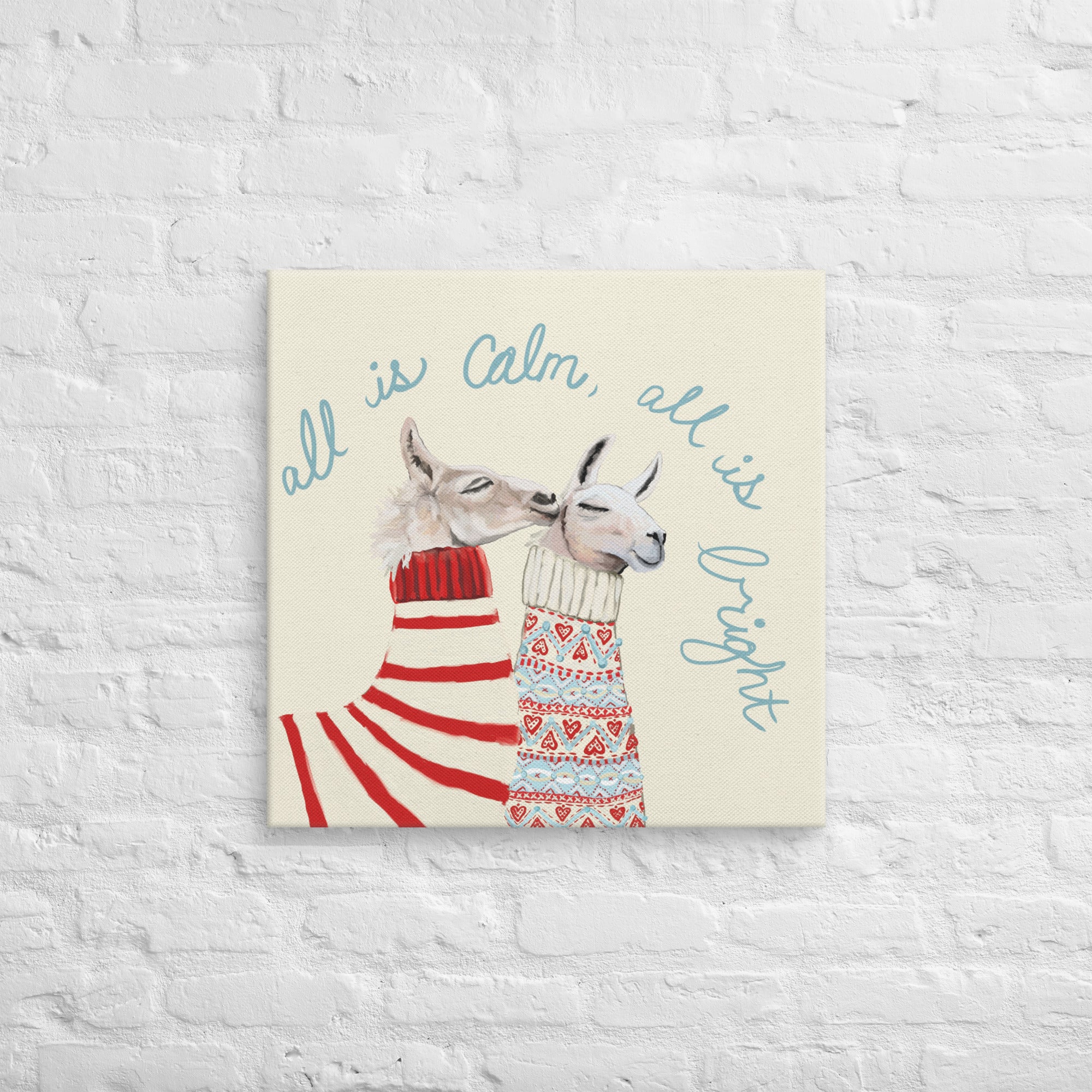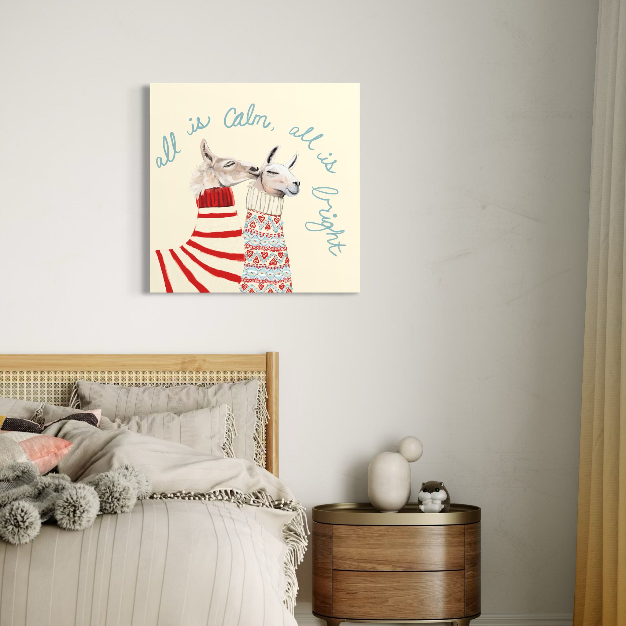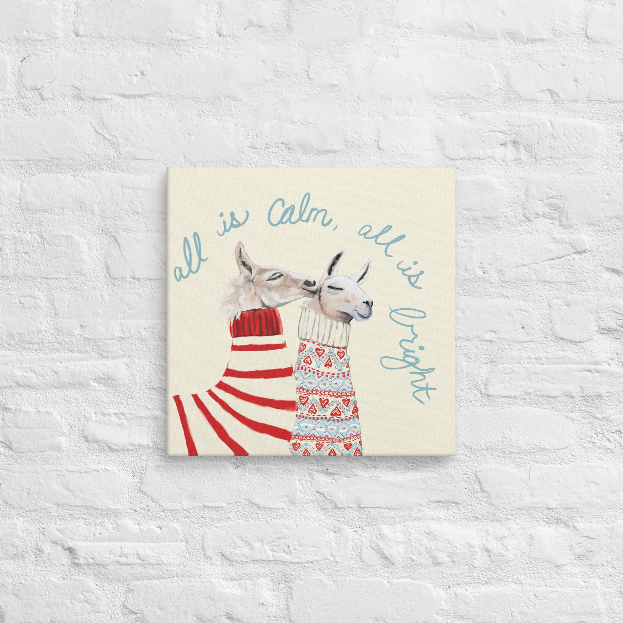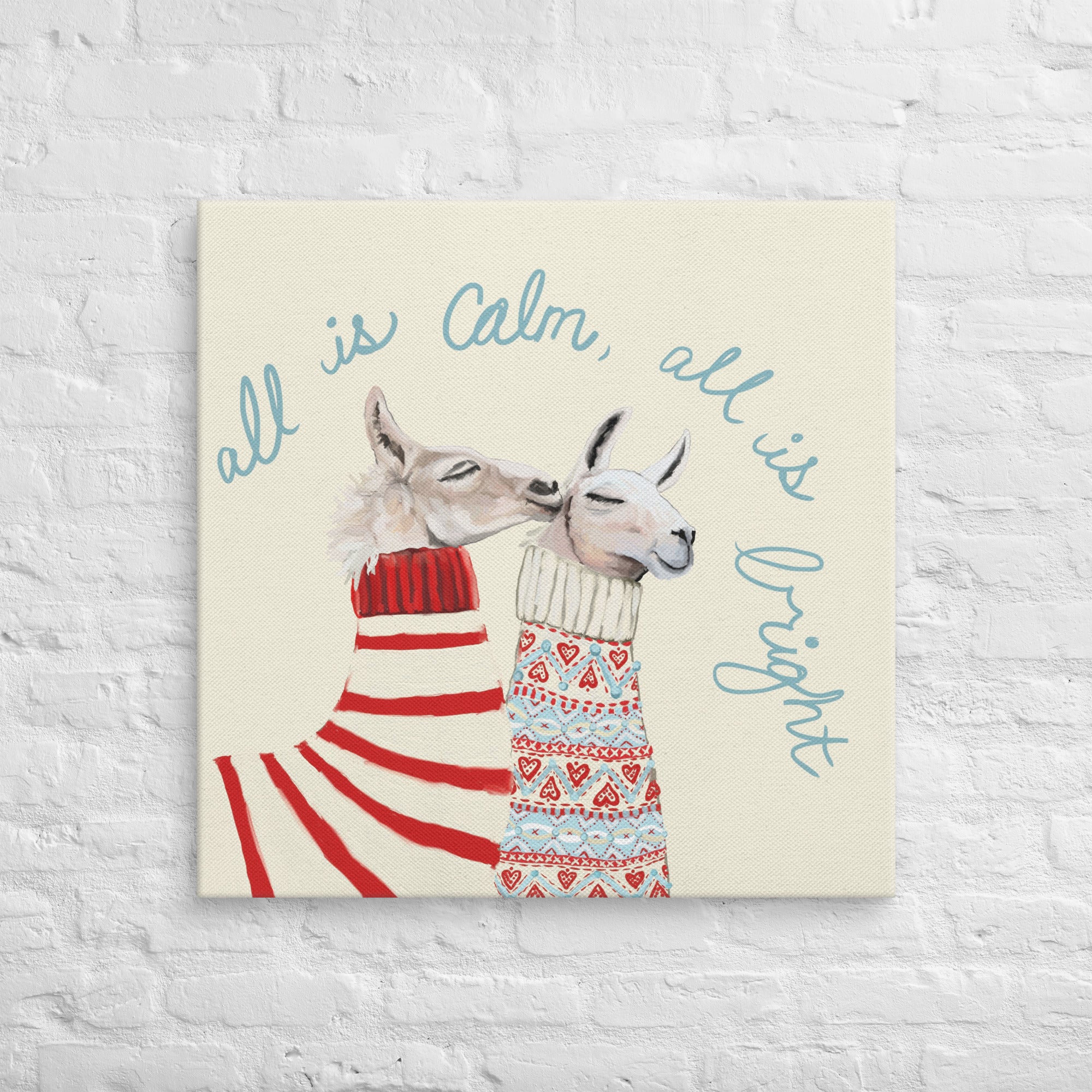 Warm in their decorative sweaters, two llamas chat and hang out with each other.
