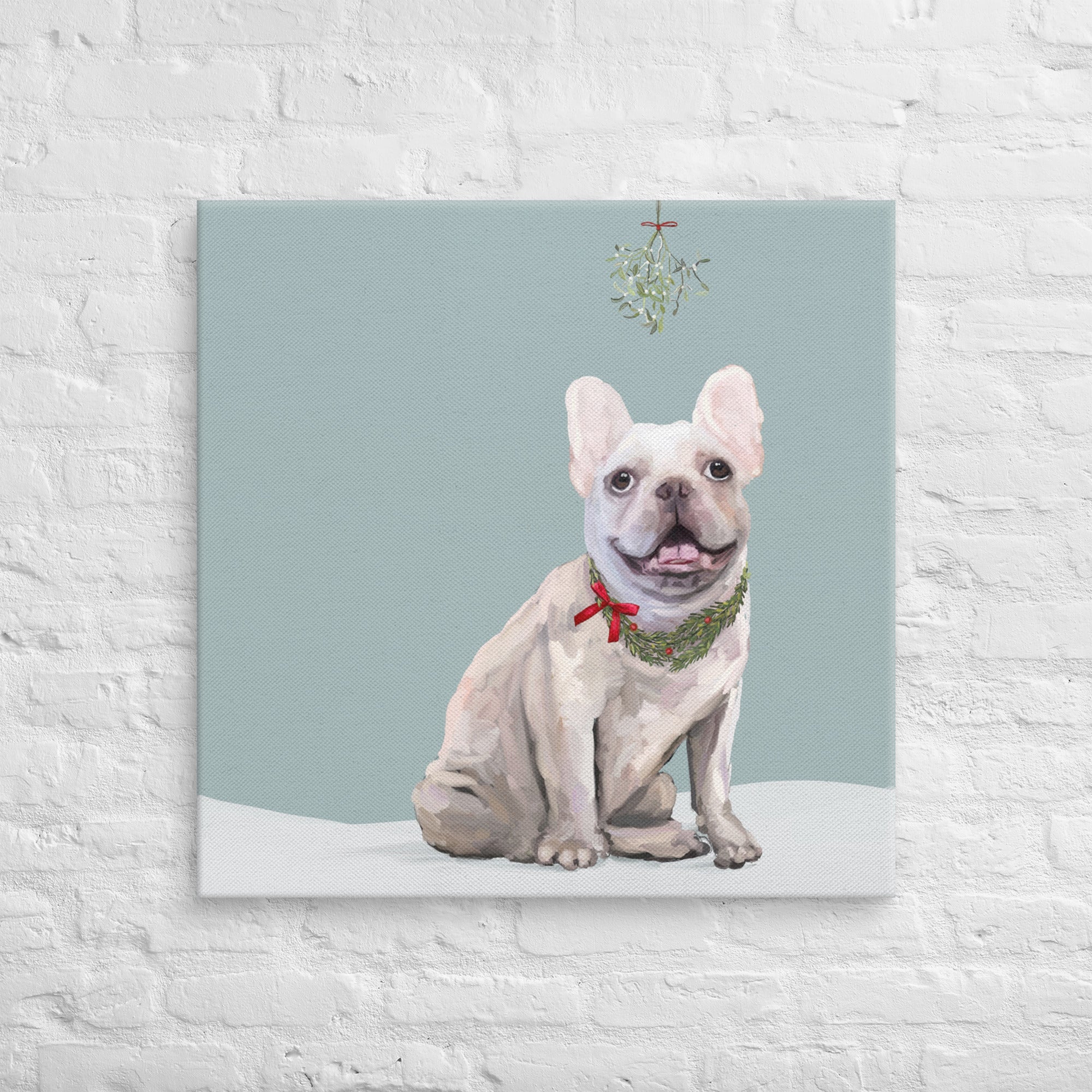 This French bulldog is all decked out for Christmas and waiting beneath the mistletoe.