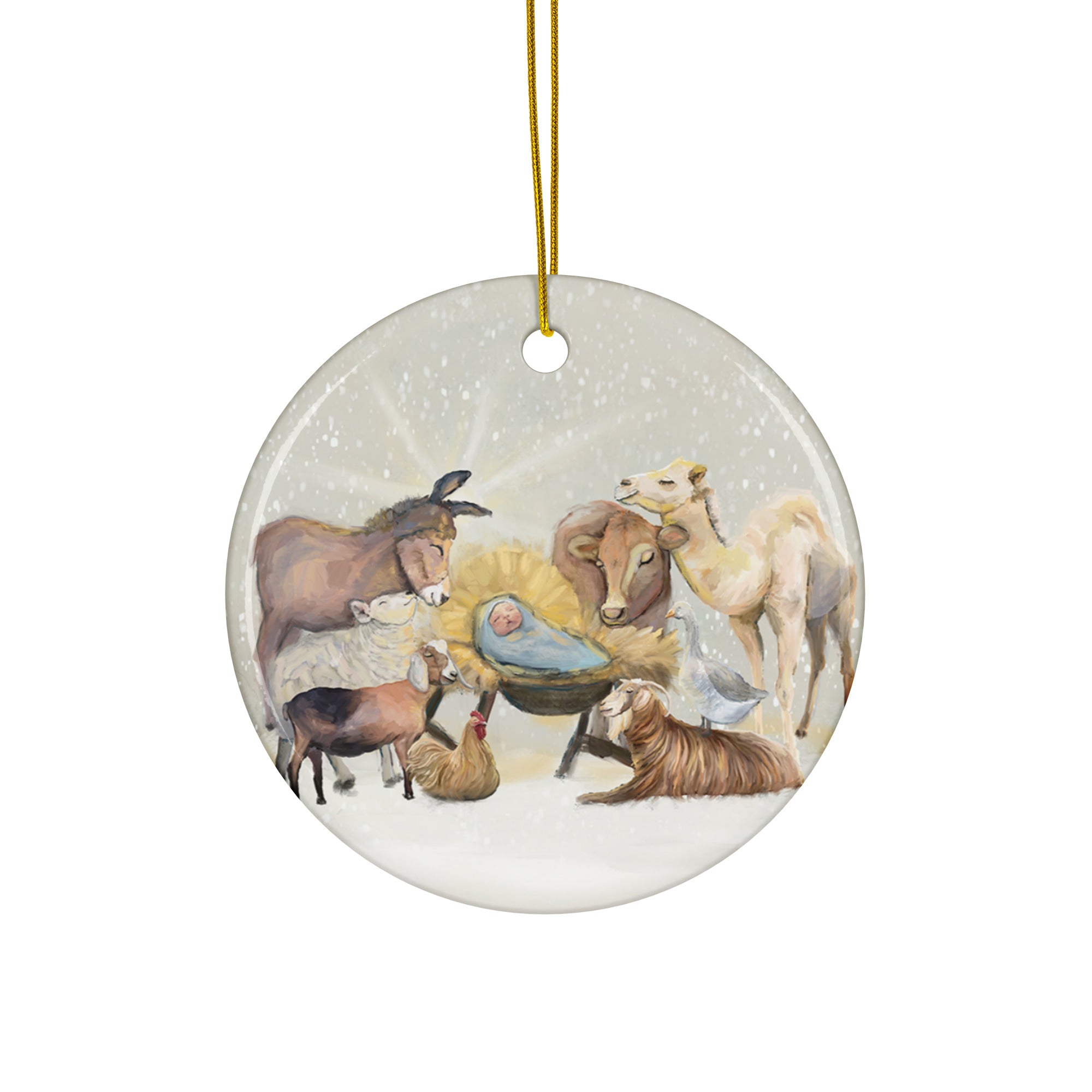 A quiet scene of animals and baby Jesus in a manger adorns this ceramic ornament.