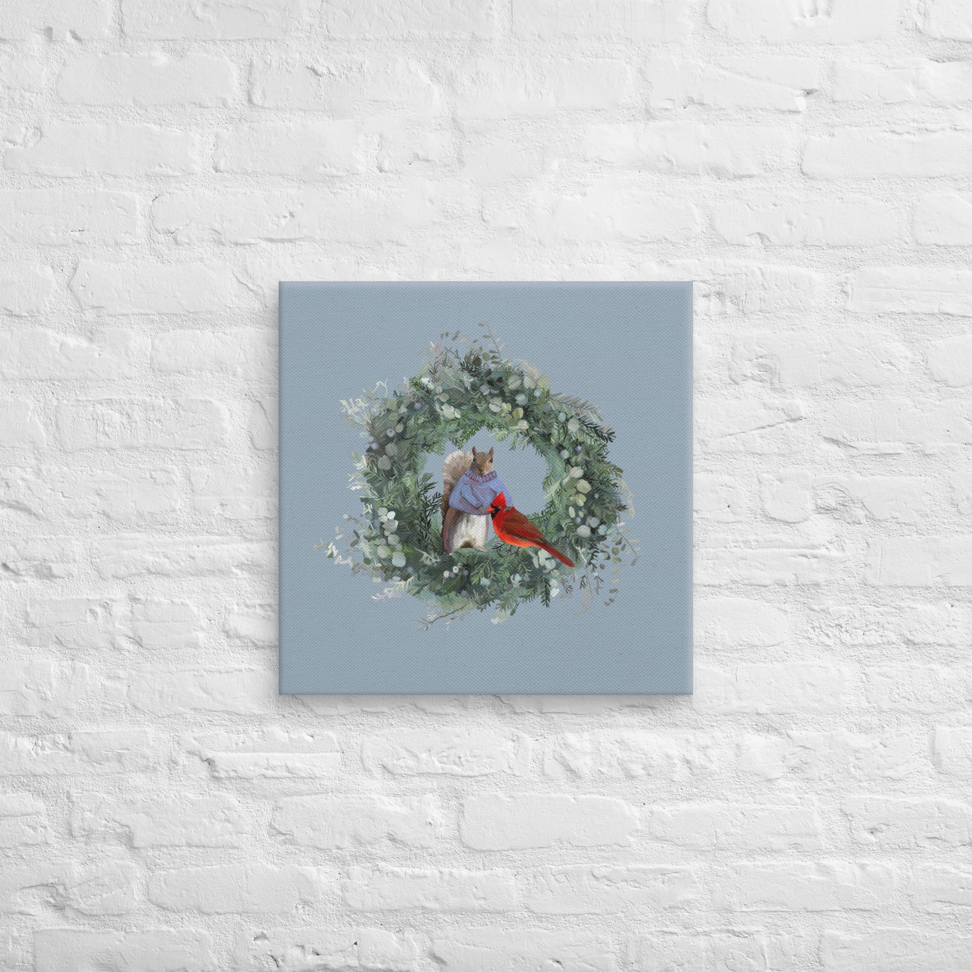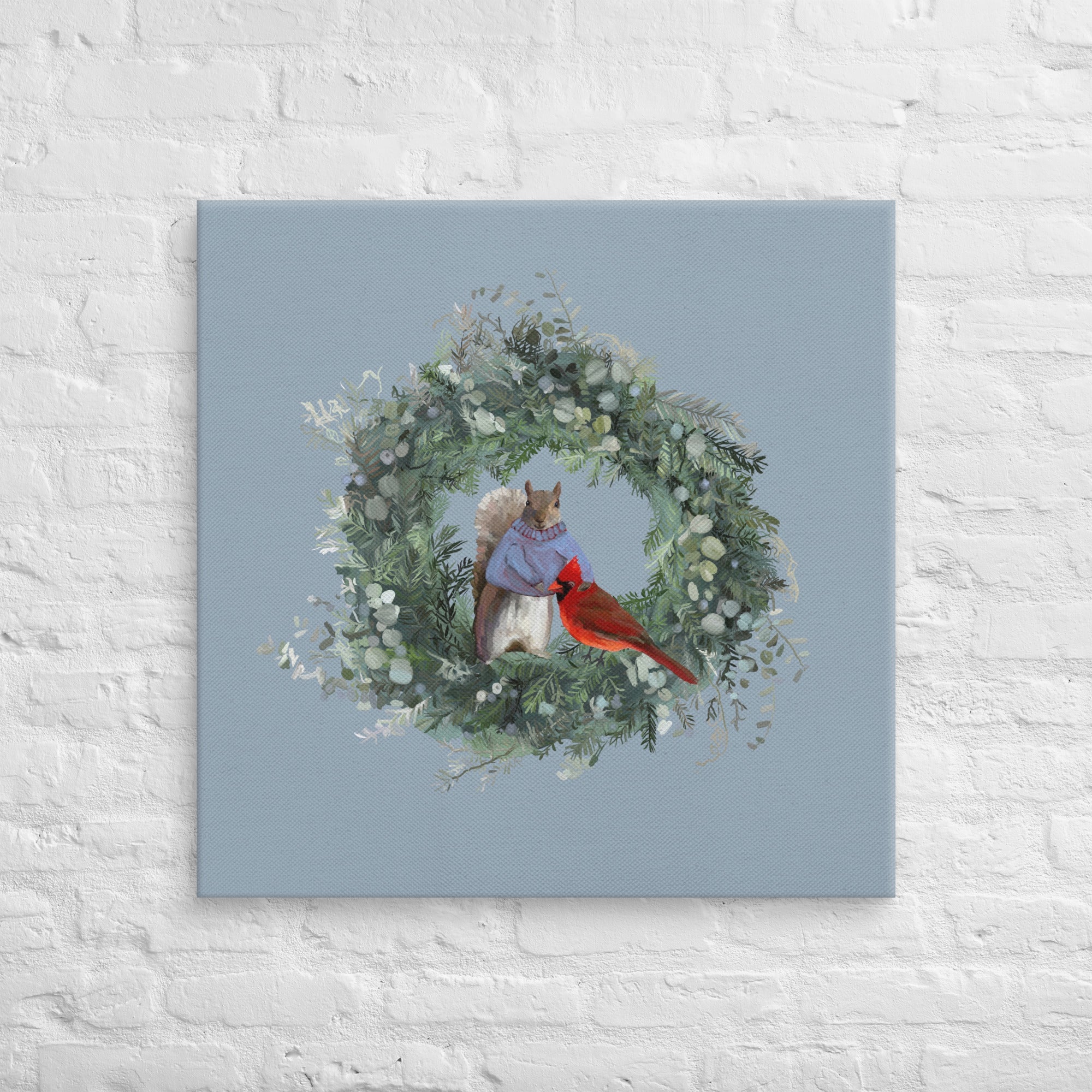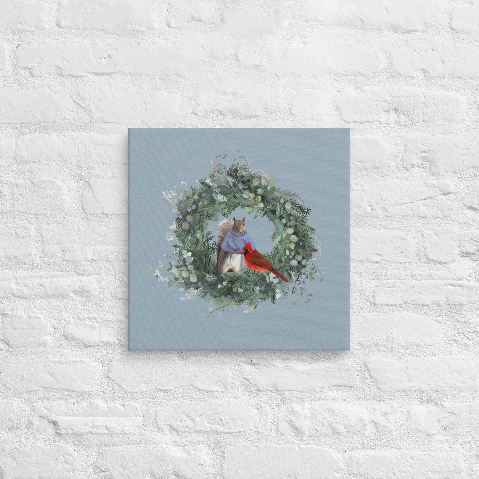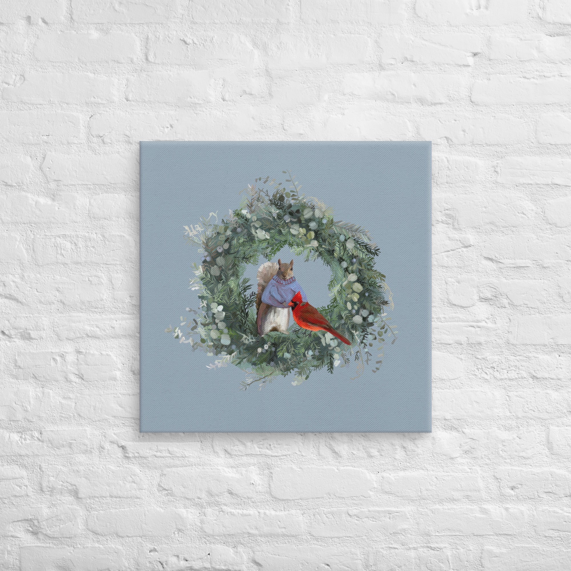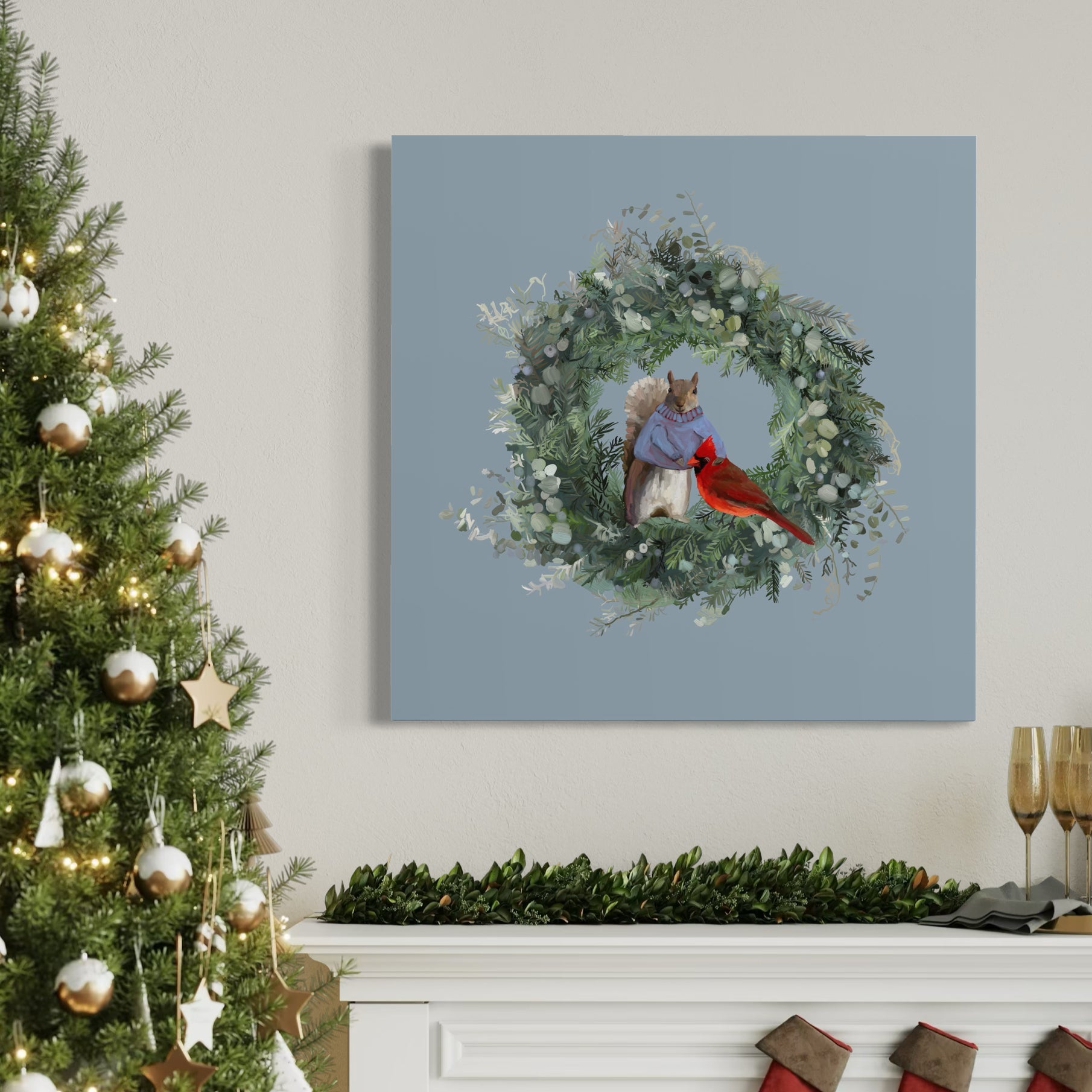 A wreath is the perfect hang out spot for this bird and squirrel pair! (The squirrel has a sweater. I repeat, the squirrel has a sweater!)