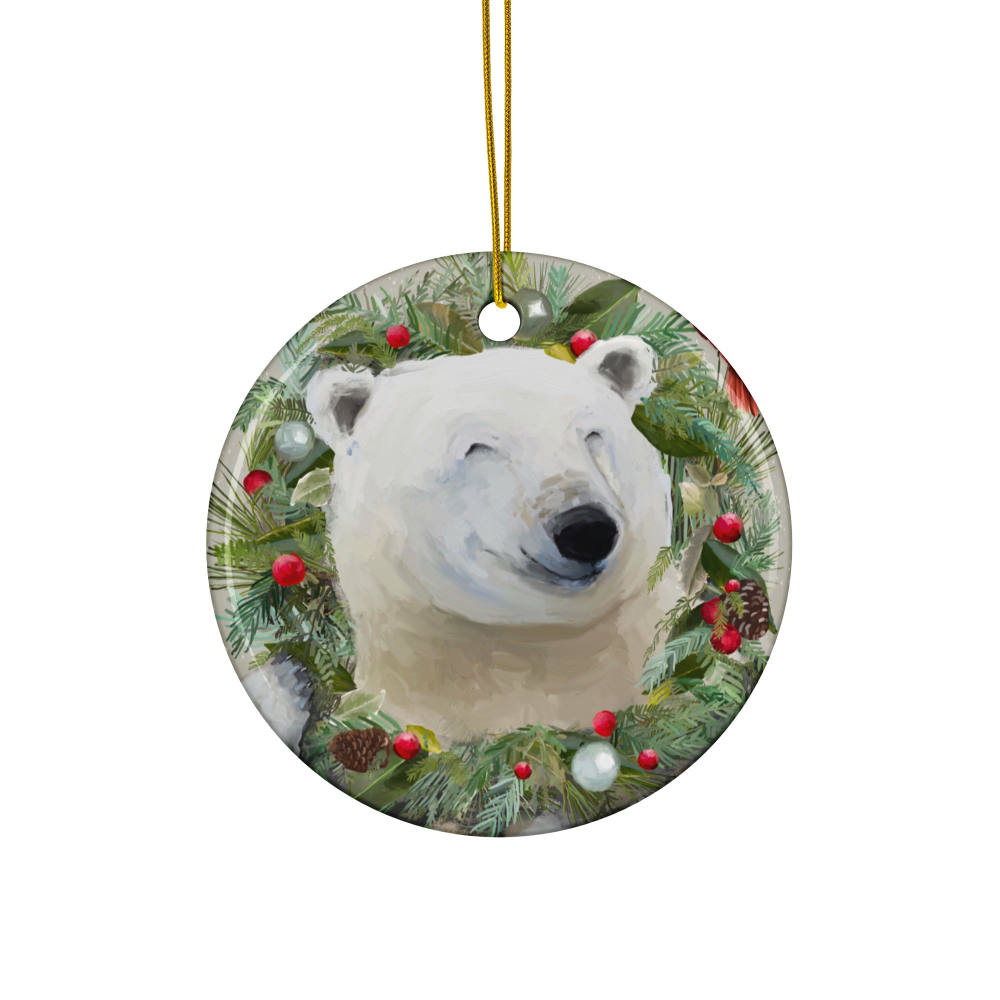 Bring the magic of Christmas to your home with this smiling polar bear, wearing a festive wreath, on this wonderful ornament.